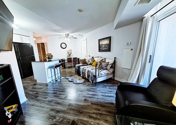 The apartment features a fully furnished kitchen with an oven, a cooktop, and utensils at the guests' disposal. Earl's Kitchen & Bar serves Canadian cuisine and is situated a 7-minute walk away. City Centre Transit Terminal - Square One bus station is quite close to the 74 m^2 apartment. Along with an indoor pool, this accommodation provides access to a spa salon, ensuring maximum relaxation. Also, take advantage of fitness classes to enrich your leisure.